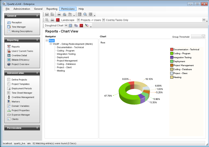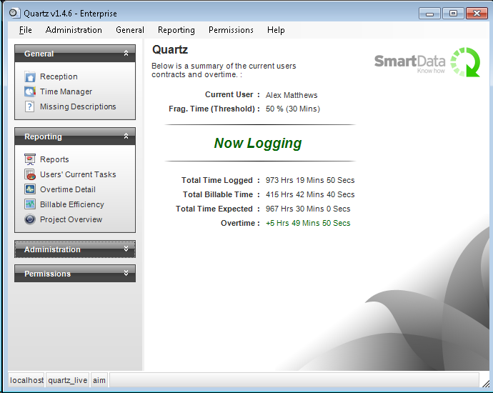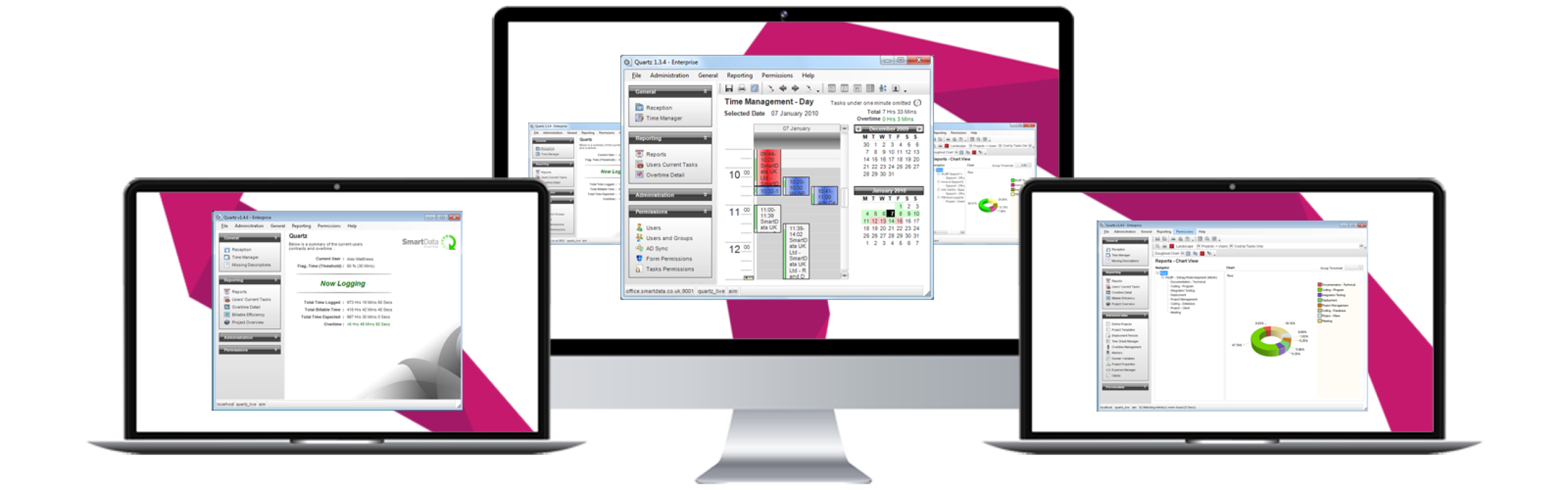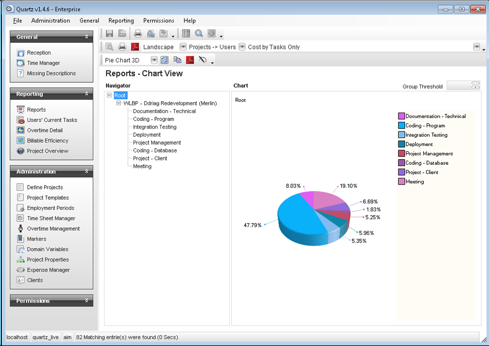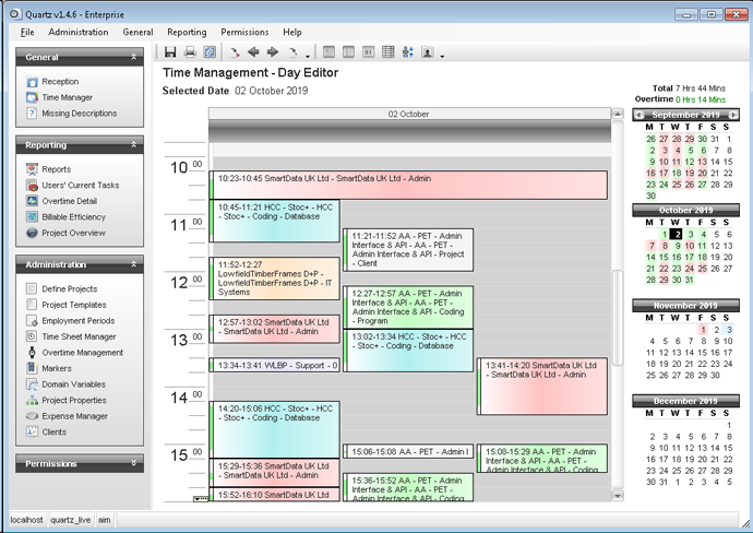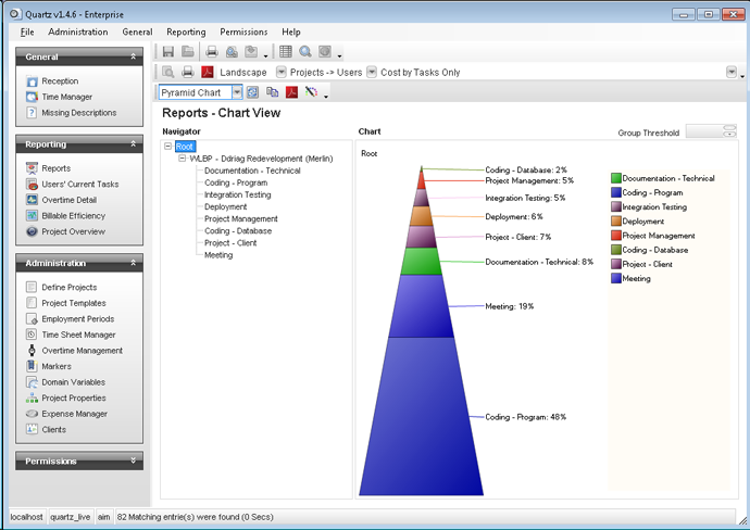 The application provides a very accurate and visual representation of tasks using a schedule view. Rather than logging time with a set timer the system continuously runs a timer and utilises a hierarchical context menu on an icon in the taskbar to identify changes between tasks, making recording very easy and efficient. Complex reports are made easy with a mechanism to build up criteria as required and many visual report modes are supported along with standard Excel and pdf representations.